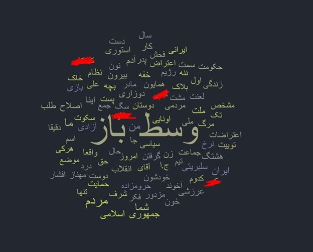 بررسی محتوای توییتهایی که در سه هفته اخیر با کلیدواژه وسط باز منتشر شده است، بیانگر اوج خشم کاربرانی است که این کلیدواژه را بهکار میبرند. این کاربران عمدتا به کسانی مثل خودشان رفتار نمیکنند، بهشدّت توهین میکنند. امکان انتشار این توهینها در یک رسانه رسمی نیست و از میان کلمات پرتکراری که در این توییتها بهکار میرود میتوان صرفا به کلیدواژههایی نظیر خفهشو، سگ، بیشرف، دوزاری، حرامزاده، لعنت، نون به نرخ روز خور، ننه! و مواردی از این دست اشاره کرد.