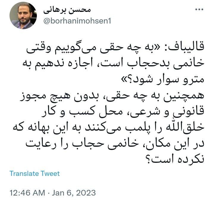 قالیباف به چه حقی میگوییم وقتی خانمی بدحجاب ،است، اجازه ندهیم به مترو سوار شود؟