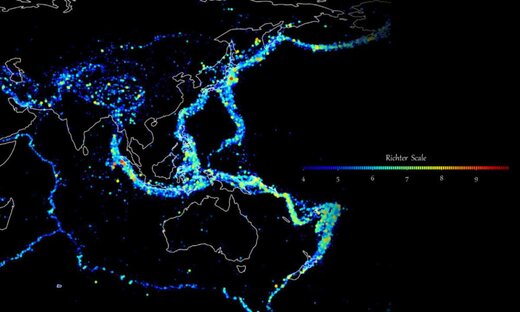 اکثر زلزله هایی که در این نقشه تجسم شده اند، در مرزهای هفت صفحه تکتونیکی اصلی، همراه با صفحه فیلیپین (جنوب ژاپن) و صفحه نازکا (غرب آمریکای جنوبی) هستند.