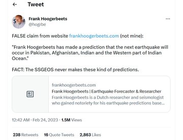 هوگربیتز در توئیت اخیرش که روز بیست و چهارم فوریه منتشر شد، نوشت:«وبسایتی به نامhttp://frankhoogerbeet.com که متعلق به من نیست، ادعای کذبی را مطرح کرده و نوشته:" فرانک هوگربیتز، پیشبینی کرده که زلزله آتی در پاکستان، افغانستان و هند و بخش غربی اقیانوس هند به وقوع خواهد پیوست" اما واقعیت این است که سازمان SSGEOS هرگز اینگونه پیشبینیهایی را انجام نمیدهد.»